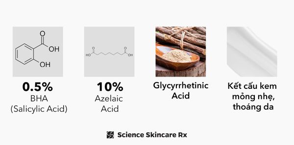 Công thức tiên tiến với sự kết hợp của hai hoạt chất mạnh mẽ: 10% Azelaic Acid giúp kháng khuẩn, giảm viêm; đồng thời tác dụng tiêu sừng của nó giúp nhẹ nhàng loại bỏ tế bào chết, ức chế sự hình thành mụn trứng cá. 0.5% Salicylic Acid là chất tiêu sừng hiệu quả, giúp hỗ trợ các hoạt chất thâm nhập sâu hơn vào bên trong da, từ đó tăng cường hiệu quả điều trị.