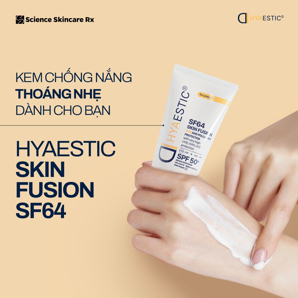 Kem chống nắng Hyaestic Skin Fusion SF64 cung cấp lớp bảo vệ toàn diện cho làn da trước tia UVA1, UVA2, UVB, IR, HEV, VIS.