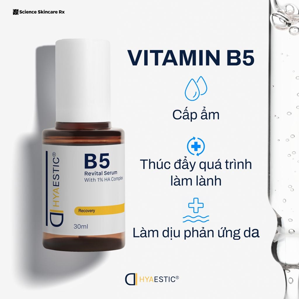 Hyaestic B5 Revital Serum là tinh chất dưỡng ẩm với công thức ưu việt gấp đôi tác dụng phục hồi nhờ sự kết hợp giữa 3% Vitamin B5 (Panthenol) và 1% phức hợp Hyaluronic Acid:
