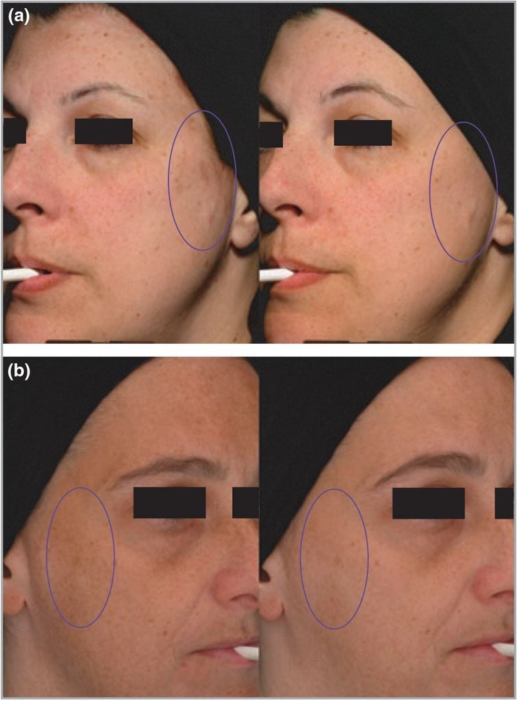 Hình minh hoạ cho tác dụng của công thức kết hợp Niacinamide và N-acetyl glucosamine (NAG) trên nền da đang gặp vấn đề tăng sắc tố. Hình bên trái được chụp ở thời điểm ban đầu và hình bên phải được chụp sau 8 tuần sử dụng công thức nói trên [2].