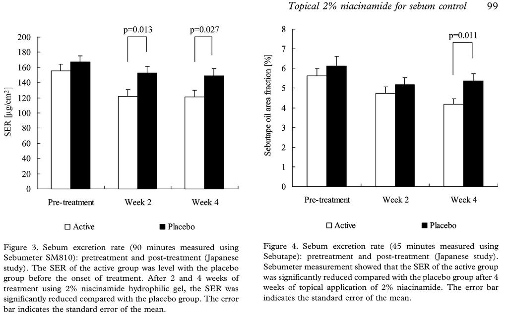 Thử nghiệm lâm sàng cho thấy: Sau 2-4 tuần và sau 4 tuần, tốc độ bài tiết bã nhờn trên da của nhóm sử dụng sản phẩm chứa 2% Niacinamide giảm đáng kể so với nhóm sử dụng giả dược [1].