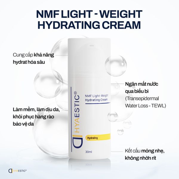 Hyaestic NMF Light-Weight Hydrating Cream là sản phẩm kem dưỡng với sự kết hợp của NMF và các thành phần dưỡng ẩm lành tính từ thiên nhiên giúp cung cấp khả năng hydrate hóa sâu, duy trì đủ lượng nước cho làn da, ngăn ngừa tình trạng thất thoát hơi nước qua biểu bì, hỗ trợ khôi phục hàng rào bảo vệ da khoẻ mạnh. Đặc biệt, kết cấu kem dưỡng rất mỏng nhẹ và thoáng da, không gây nhờn rít, dùng được cho mọi loại da kể cả da mụn, da nhạy cảm, da sau tổn thương hoặc điều trị thẩm mỹ, da đang sử dụng các hoạt chất treatment.