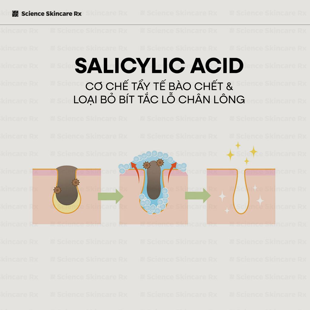 Salicylic Acid có khả năng tẩy tế bào chết ở lớp ngoài cùng của da thông qua cơ chế làm bong tróc lớp sừng.[5] Không giống với hầu hết các AHA chỉ tan trong nước, Salicylic Acid tan trong dầu, dễ dàng thâm nhập vào lỗ chân lông và trực tiếp phá vỡ các nút sừng thông qua việc hoà tan chất kết dính tế bào giữa các tế bào sừng. Nhờ đó, lỗ chân lông trở nên thông thoáng và không còn bít tắc, tình trạng mụn được cải thiện đáng kể.