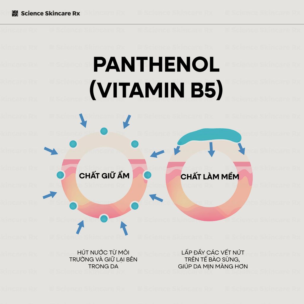 Khi được bôi lên da, Panthenol sẽ chuyển hoá thành dạng hoạt động của vitamin B5, hay còn gọi là Pantothenic Acid. Vitamin B5 rất cần thiết trong việc duy trì chức năng của hàng rào bảo vệ da, nhờ đó giúp ngăn ngừa hiện tượng da mất độ ẩm (mất nước qua lớp biểu bì - Transepidermal Water Loss). Ngoài ra, Panthenol còn có tác dụng chống viêm và giúp làm giảm kích ứng, mẩn đỏ, cháy nắng, viêm mụn và hỗ trợ phục hồi da.