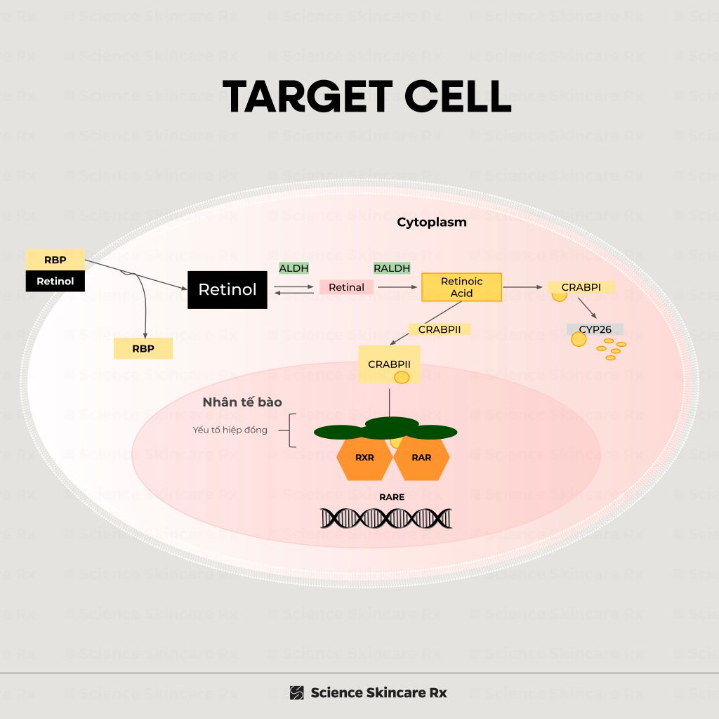 Và điều kiện tiên quyết để quá trình này diễn ra, Retinol và các tế bào sẽ luôn hoạt động theo quy tắc chìa khóa - ổ khóa. Vốn dĩ trên bề mặt của các tế bào, chúng luôn có thụ thể (tạm gọi là ổ khóa), và để kích hoạt tế bào đó hoạt động thì cần phải có Retinoic acid (tạm gọi là chìa khóa). Vậy nên, khi Retinol dung nạp vào da, chúng cần phải chuyển đổi thành Retinoic acid thì mới có thể hoạt động.