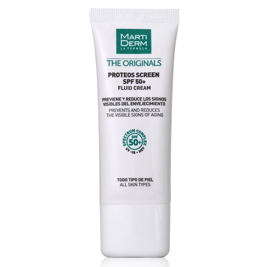 MartiDerm The Originals Proteos Screen SPF50+ Fluid Cream là kem chống nắng dạng lỏng dễ hấp thụ với chỉ số SPF 50+ giúp ngăn ngừa và sửa chữa các dấu hiệu lão hoá da sớm. Sản phẩm cung cấp màng lọc chống nắng phổ rộng chống lại các tia UVA, UVB, IR (hồng ngoại), HEV (ánh sáng xanh). Sự kết hợp của Proteoglycans, phức hợp Spectrum Complex, phức hợp Hyaluronic Acid & Silicon Complex giúp giữ cho làn da trẻ trung, tươi tắn và đều màu. Kết cấu dạng cream-to-powder độc đáo mang lại cảm giác mượt mà, mỏng nhẹ tựa "vô hình" trên da.