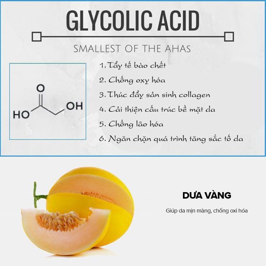 • Chứa nồng độ 5% AHA (Axit Glycolic) giúp loại bỏ tế bào chết hoàn toàn dịu nhẹ trên da, không mài mòn bề mặt, kích thích sản sinh tế bào da mới mịn màng hơn.