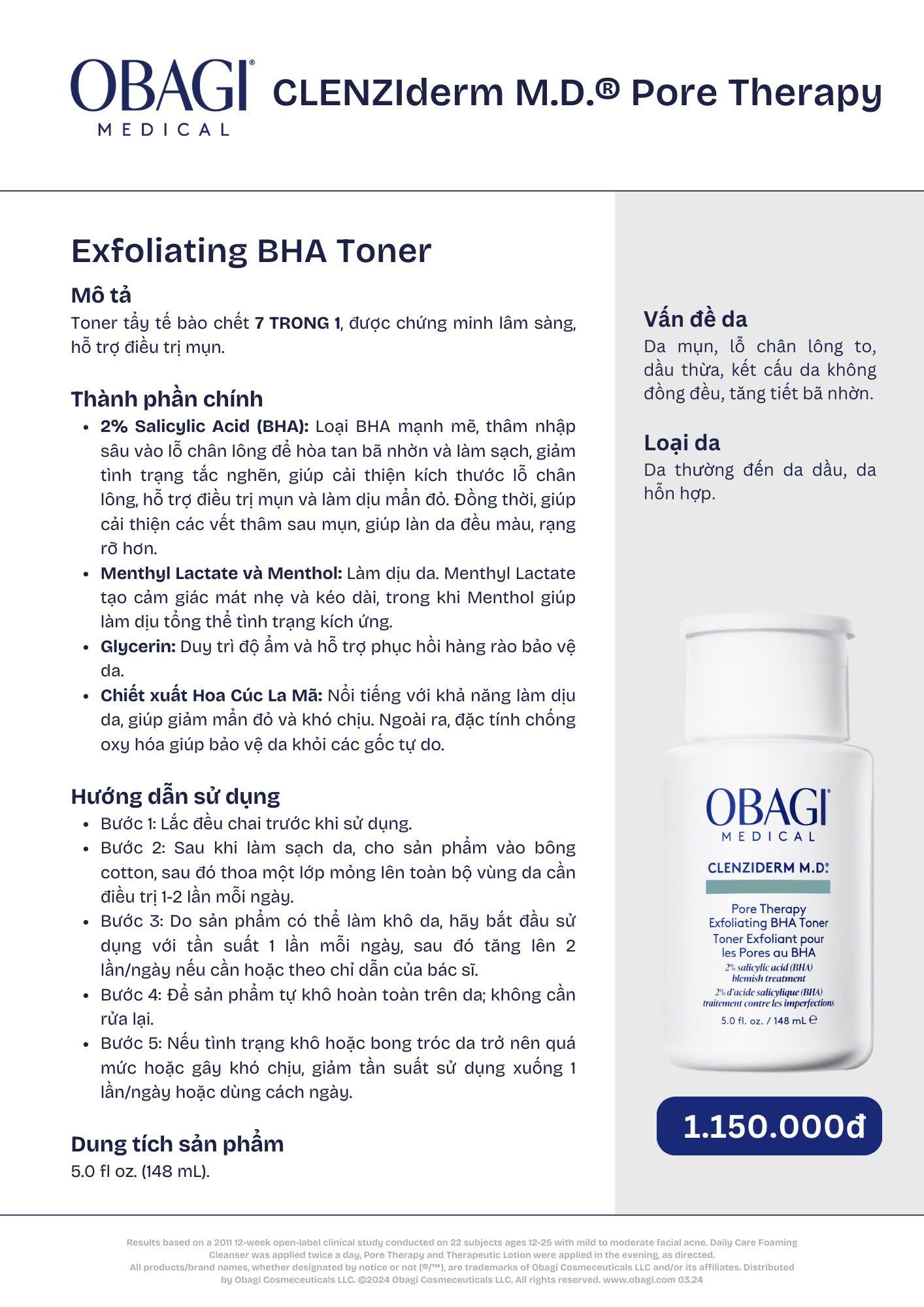Sữa rửa mặt dù tốt đến mấy cũng không thể nào loại bỏ được bụi bẩn, lớp trang điểm, bã nhờn, tế bào chết tận sâu trong lỗ chân lông. Những nhân tố ẩn sâu trong da này có nguy cơ khiến tình trạng mụn nghiêm trọng thêm. Obagi CLENZIderm Pore Therapy là dung dịch đặc trị giúp sạch sâu lỗ chân lông, làm sạch da của bạn. Thành phần tẩy tế bào chết trong Obagi CLENZIderm Pore Therapy nhẹ nhàng tẩy tế bào chết làm tắc lỗ chân lông, ngăn cản quá trình phục hồi của làn da. Sử dụng sản phẩm sau khi rửa mặt giúp da hấp thu hiệu quả bước điều trị mụn tiếp theo. Da sẽ sạch sâu và lỗ chân lông thu nhỏ nhờ Obagi CLENZIderm Pore Therapy.