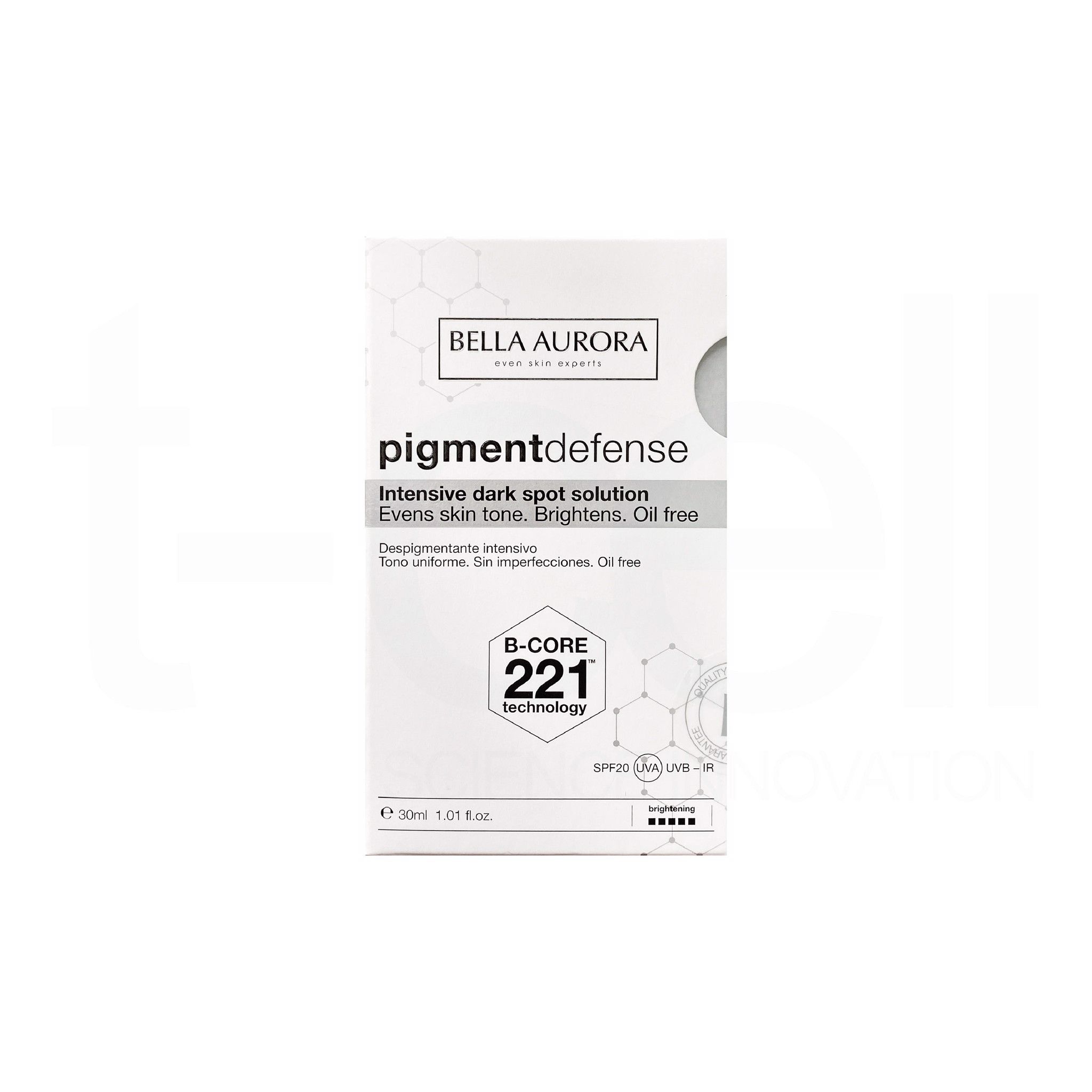 Pigment Defense Intensive Dark Spot Solution là serum dưỡng trắng cho làn da tối màu, ngăn ngừa thâm nám hình thành do quá trình lão hóa, ô nhiễm môi trường và ánh nắng mặt trời. Với công thức độc quyền B- CORE 221™ - một công nghệ hiệu chỉnh sắc tố được phát triển bởi Bella Aurora - giúp làm giảm đốm nâu và ngăn chặn sự xuất hiện trở lại của những đốm mới; giúp làn da được đều màu, rạng rỡ hơn. Kết hợp cùng Vitamin C gốc đường ổn định (Ascorbyl Glucoside) chống oxy hóa, trung hòa gốc tự do và làm sáng, cải thiện đốm sắc tố sẵn có trên da; Kojic Acid - hoạt chất có khả năng ức chế sự kích hoạt của enzyme Tyrosinase, ngăn ngừa hình thành đốm sắc tố mới thông qua ngăn chặn sản sinh melanin. Sản phẩn chứa thành phần độc đáo men Thermus Thermophillus Ferment giúp trung hòa các chất ô nhiễm trong môi trường, bảo vệ làn da trước các tác nhân gây hại từ bên ngoài, bảo vệ cấu trúc da, duy trì sự săn chắc. Ngoài ra, chiết xuất dầu cọ Babassu giàu các acid béo nuôi dưỡng làn da, giúp da khỏe mạnh,  kháng viêm và chiết xuất vỏ cây Enantia chlorantha có đặc tính giúp làm se, tinh chỉnh lại lỗ chân lông, giảm thiểu bóng dầu trên da. Chỉ số SPF 20 cùng màng lọc chống nắng bảo vệ da tối ưu khỏi tác động của các bức xạ có hại UVA / UVB / IR.