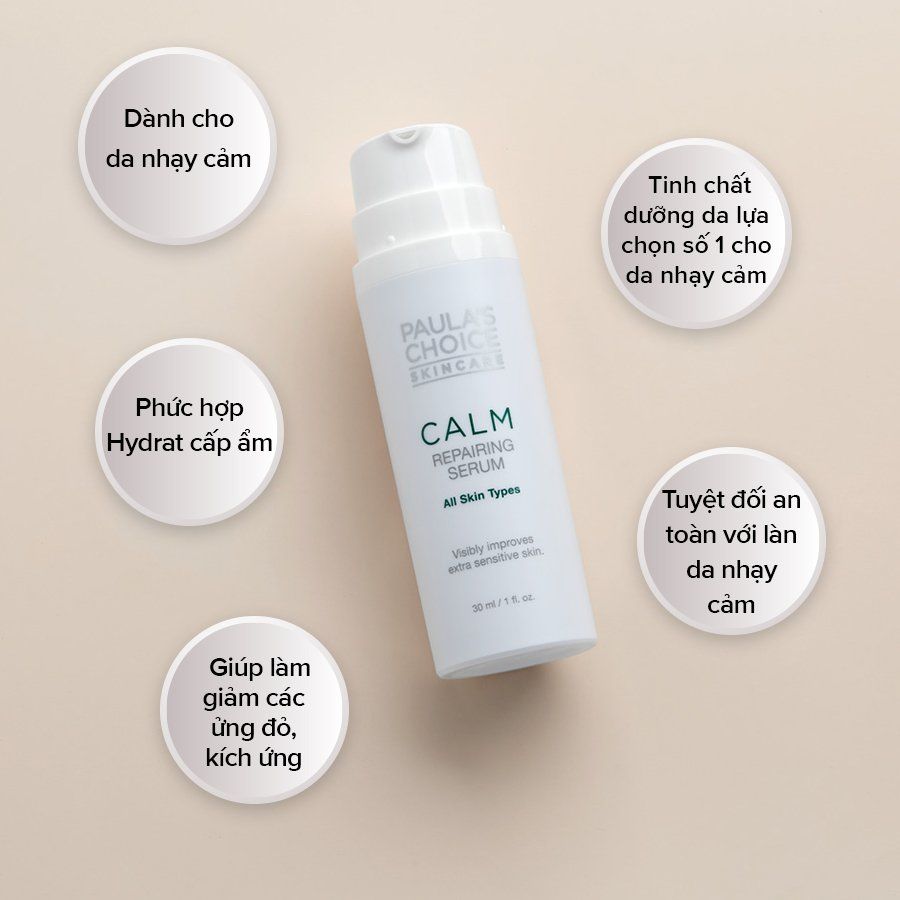 • Paula's Choice CALM Redness Relief Repairing Serum là tinh chất (serum) dành cho da nhạy cảm, tổn thương & da lão hoá, giúp làm dịu, nuôi dưỡng và phục hồi da, đồng thời chống lão hoá dịu nhẹ.