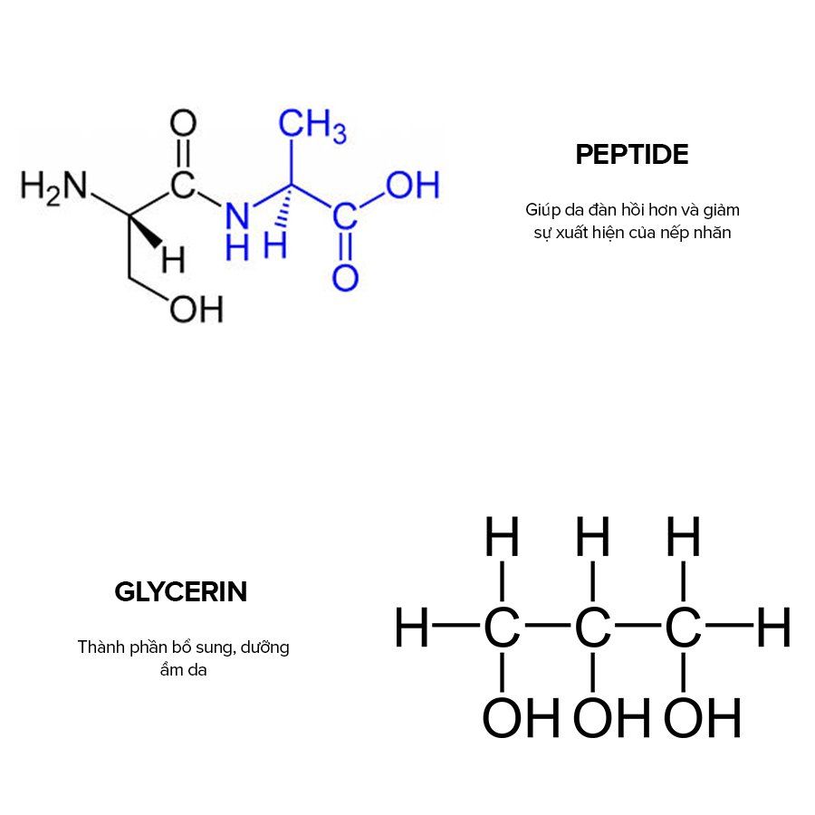 • Peptide là những chuỗi dài của axit amin, thuộc phân đoạn của protein. Trong cơ thể, thành phần này hỗ trợ điều hòa hoạt động của nhiều hệ thống khác nhau bằng cách tương tác mật thiết các tế bào, truyền đạt “mệnh lệnh” nhằm khắc phục những khiếm khuyết, tăng cường tín hiệu tích cực. Chúng trở thành “ngòi nổ” đáng kinh ngạc thúc đẩy hiệu quả chống nhăn và lão hóa, thiết lập sức đề kháng mạnh mẽ cho da.